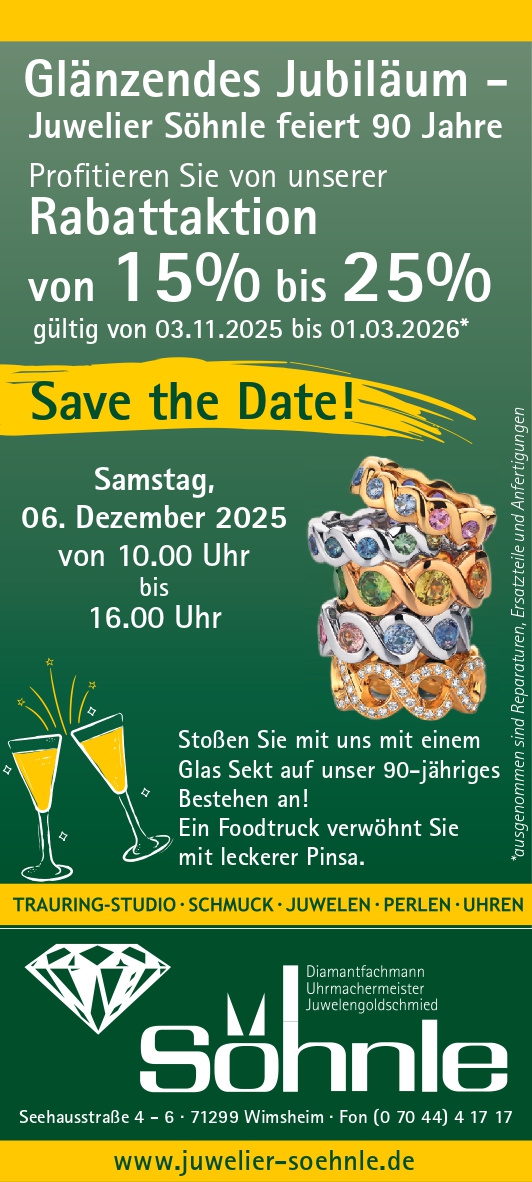 Gewinnspiel am 6.12.2025 anlässlich des 90-jährigen Firmenjubiläums von Juwelier Söhnle